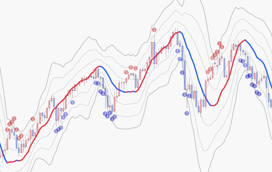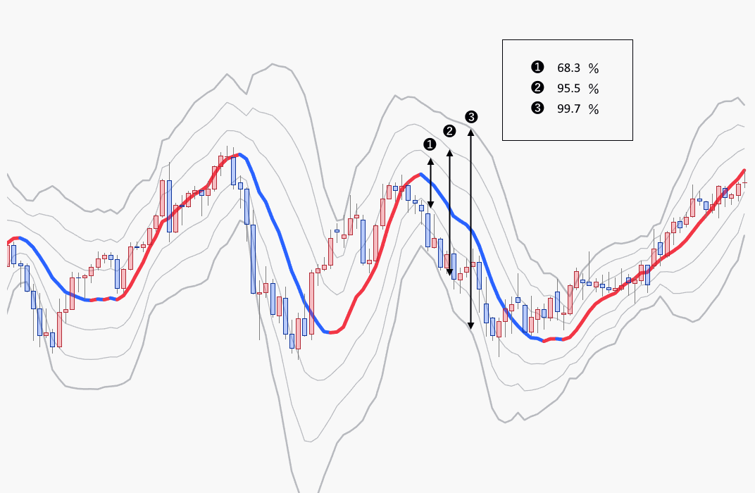 中心線と標準偏差σを ±1 〜 ±3 倍した合計6本のバンドが表示されるが、