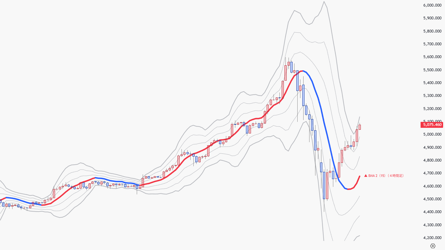 また、価格がBMAラインをクロスした後、そのままの上下関係を維持する場合であっても、急激にトレンドとは逆の2σや3σまで価格が動く場合には、価格が行き過ぎた反動で、もとのトレンドに戻る場合もある。
