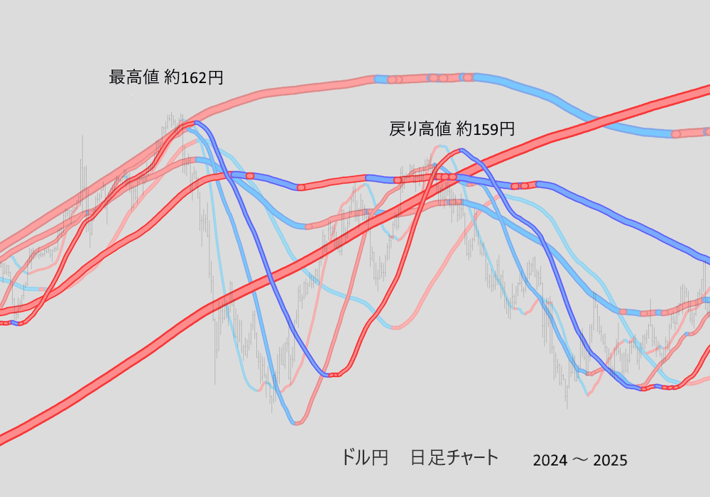 ちなみに、この日足のチャートは、ドル円で、左上部が、2024年7月3日につけた数十年ぶりの最高値約162円になった場面、中央やや右上部の高値が、その後の戻り高値 約159円になった場面が入っている。