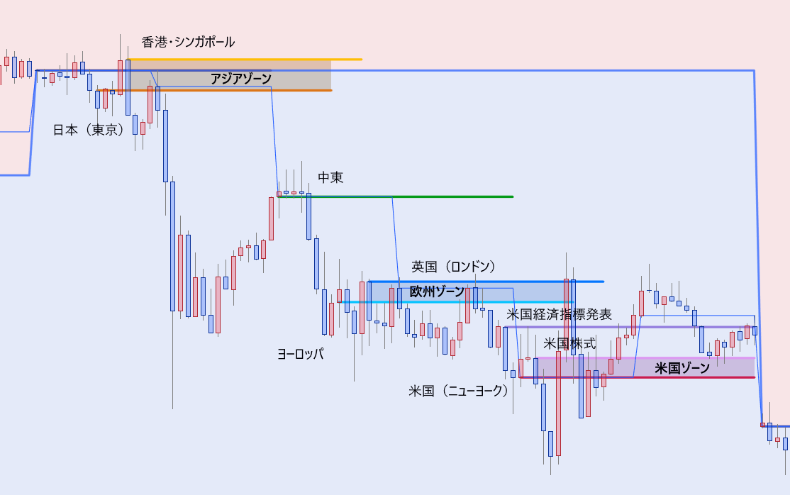 時間足には、5分足、15分足、30分足、1時間足、4時間足、日足、週足、月足などがあるが、大きな時間足になるほど、その開始時刻が、大きな価格変動の要因となる。